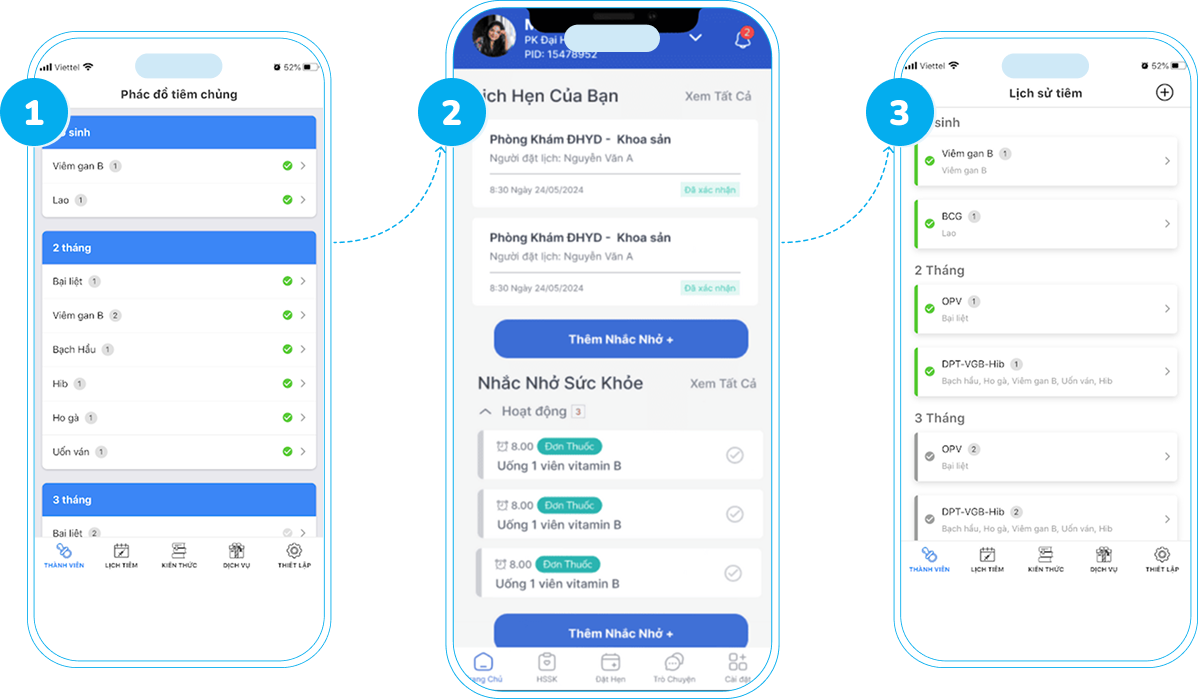 • Ứng dụng thông minh giúp phụ huynh dễ dàng theo dõi lịch sử tiêm, đặt lịch, nhận nhắc hẹn tự động qua app/Zalo/SMS.